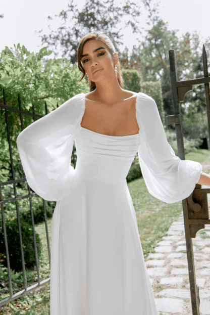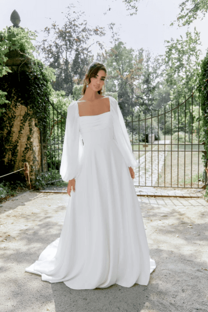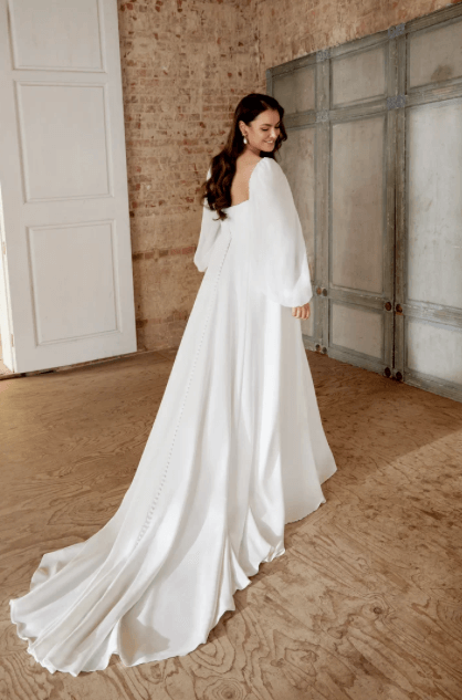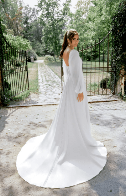 Matte Satin A-line gown with squared off scoop neckline. Flattering pleating at bodice is paired with a flattering inset waist. Dreamy blouson sleeves are made in a lightweight chiffon. Scoop back neckline is finished with buttons down to the end of the chapel length train for a simply bridal look!