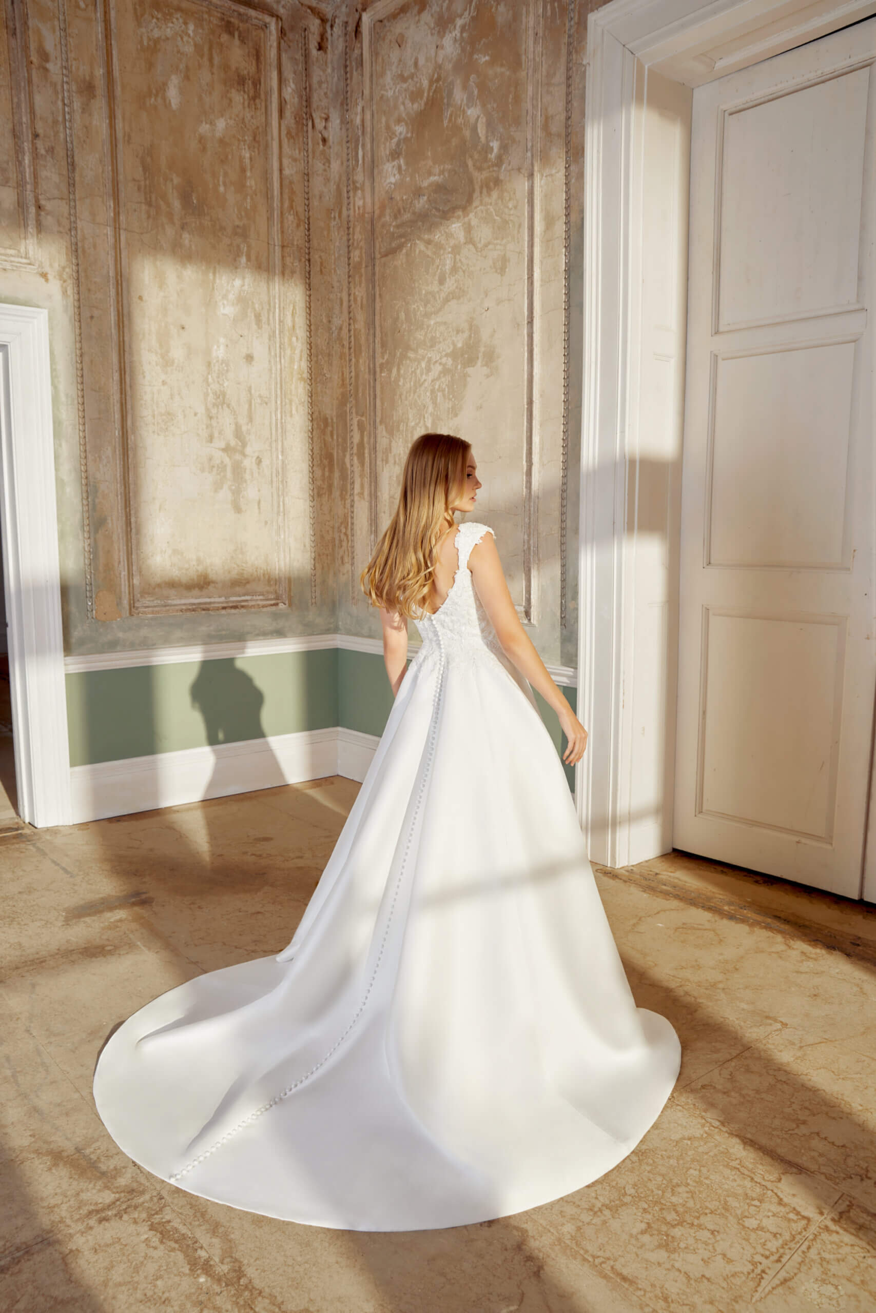 Stunning mikado ballgown with a V-neckline and sparkling cap sleeves. Fully lined bodice and straps are adorned with beaded and sequined lace appliques. Beaded embroidery includes sequins and sparkling seed beads. Skirt is detailed with pockets! Soft V-back neckline is complete with Mikado covered buttons extending to the end of the chapel length train!