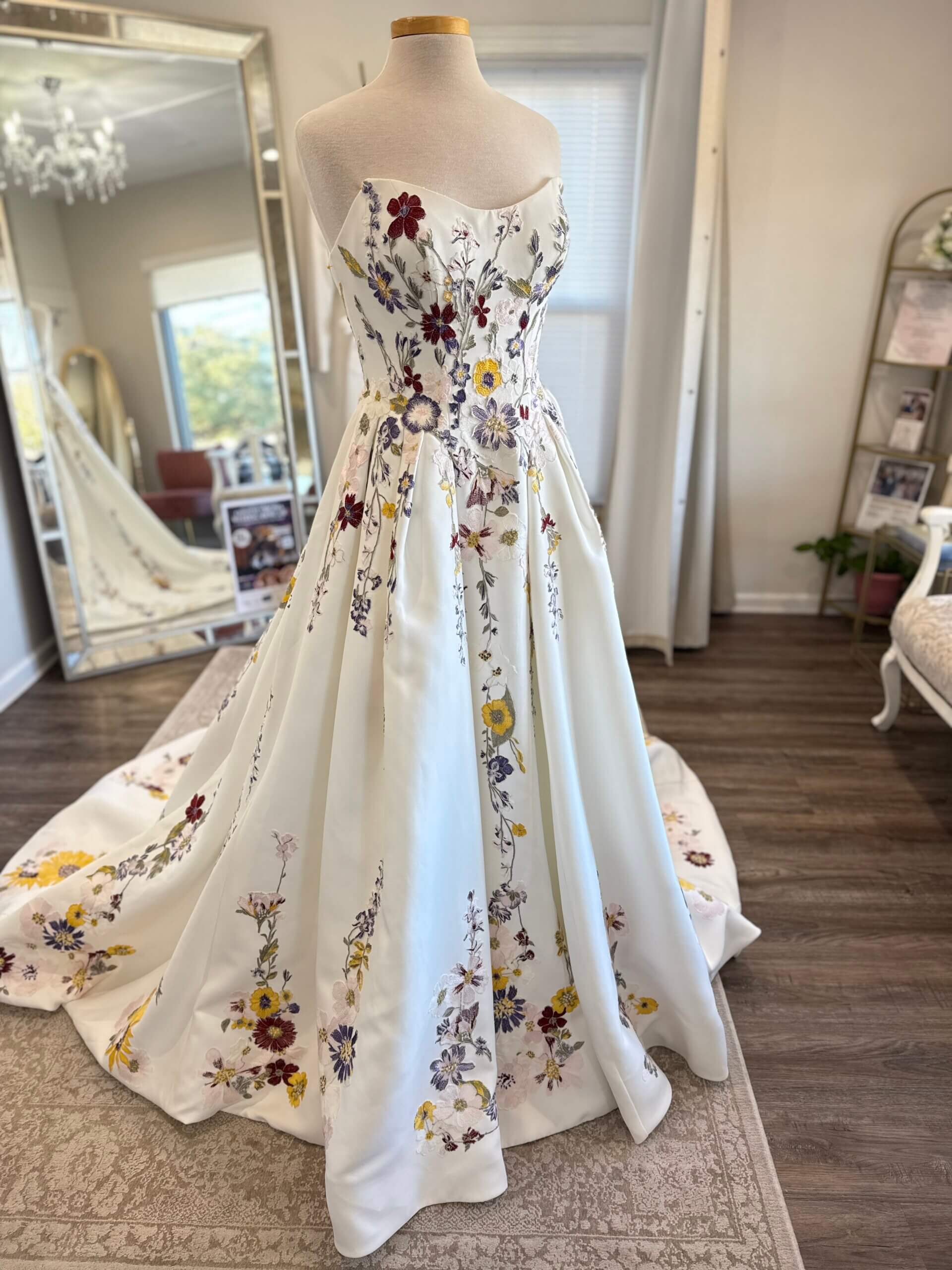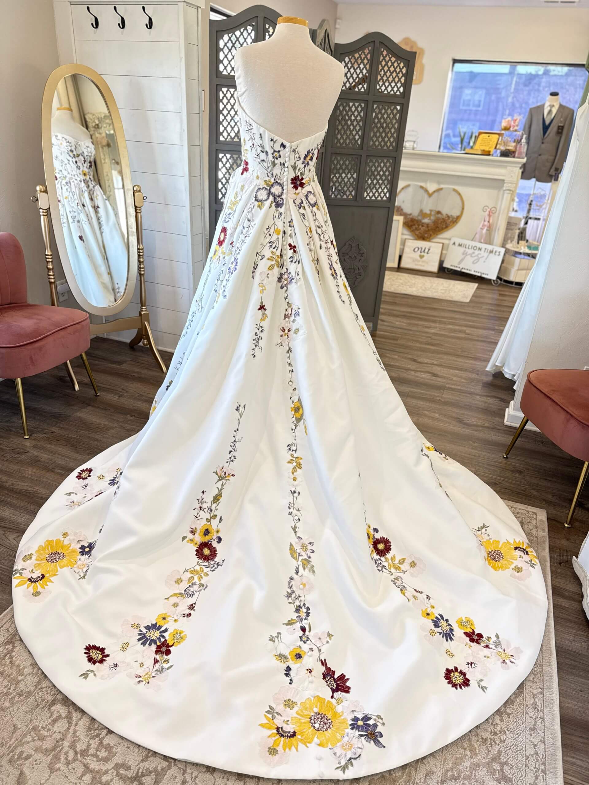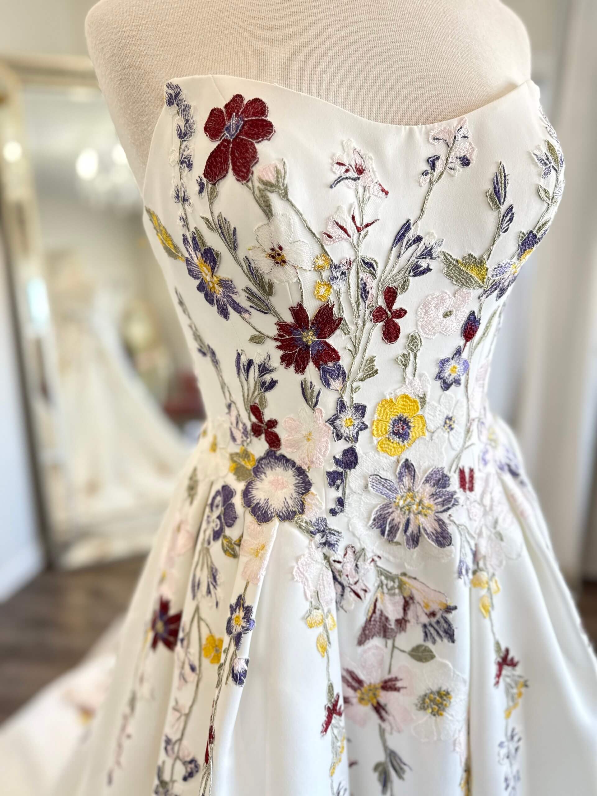 Looking for the garden of Eden in a dress? Â Find yourself wrapped in colorful florals or order in all ivory! Â This dress comes in a very soft matte satin with gorgeous floral lace. Â The scoop cat eye neckline is flattering on all!