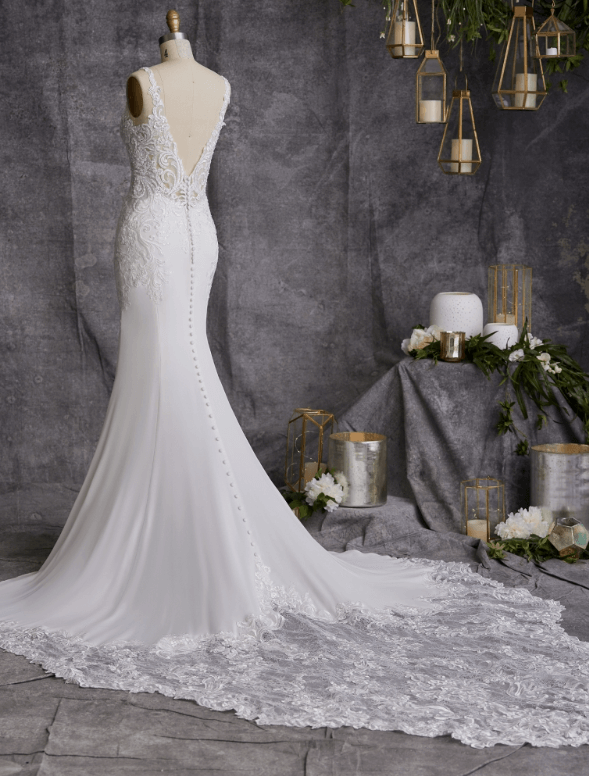 Beautiful crepe and lace fitted wedding dress with a dramatic lace train!
