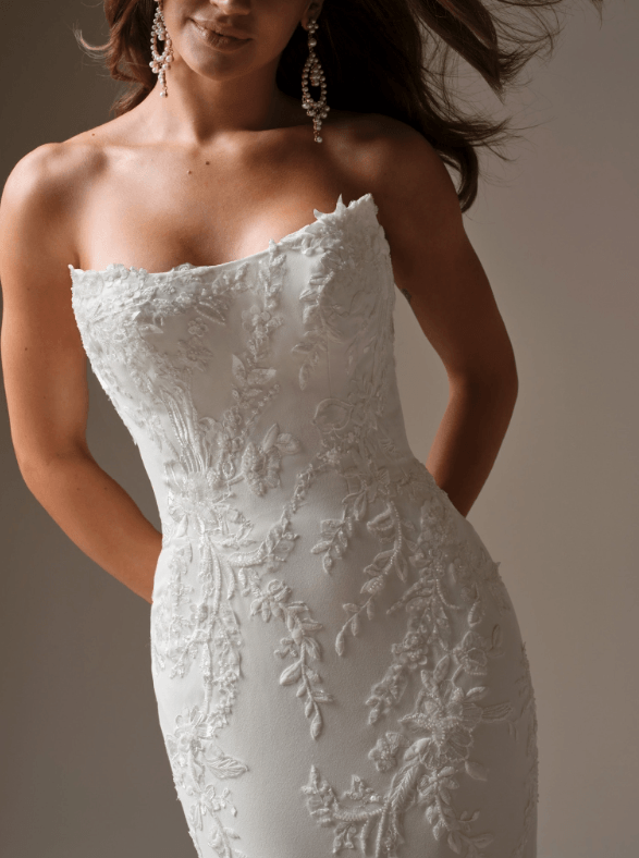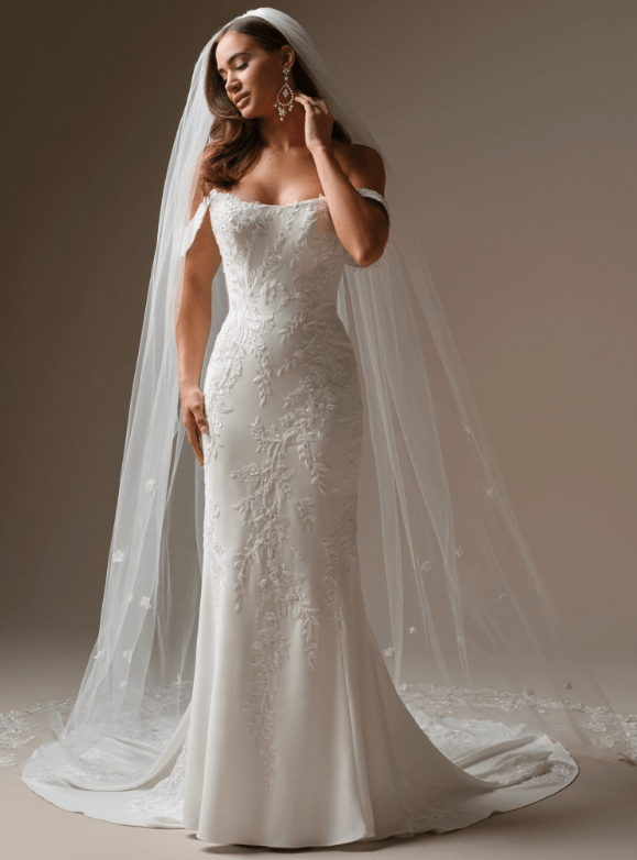 Customize by adding off the shoulder cap sleeves and the designer makes a matching cathedral veil!