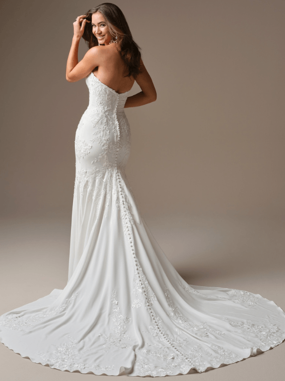 Refined fit-and-flare gown with cat eye neckline and sequin lace! Lined with stretch jersey for comfort and buttons trailing to the hem!